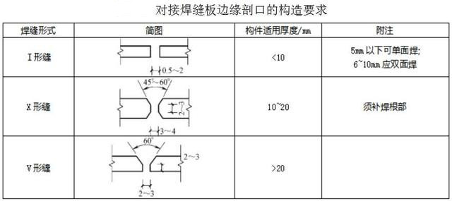 焊接接头的形式有对接焊缝和角焊缝。对接焊缝板边缘剖口的构造要求见表: